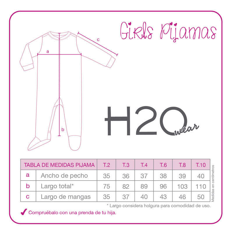 Pijama de 1 pieza para niñas en tela 100 % Poliéster reciclado,liso con motivo H2O Wear,manga larga, gorro con orejas , cierre delantero. Disponible en tallas 4,6,8,y 10. Para prolongar su durabilidad lavar con agua tibia,detergente suave y no planchar.Nuestra marca H2O Wear esta permanentemente preocupada de desarrollar productos cómodos y de alta calidad. Todo el espíritu de nuestra marca lo da un innovador equipo de personas que en cada temporada está creando nuevos conceptos para sus prendas.