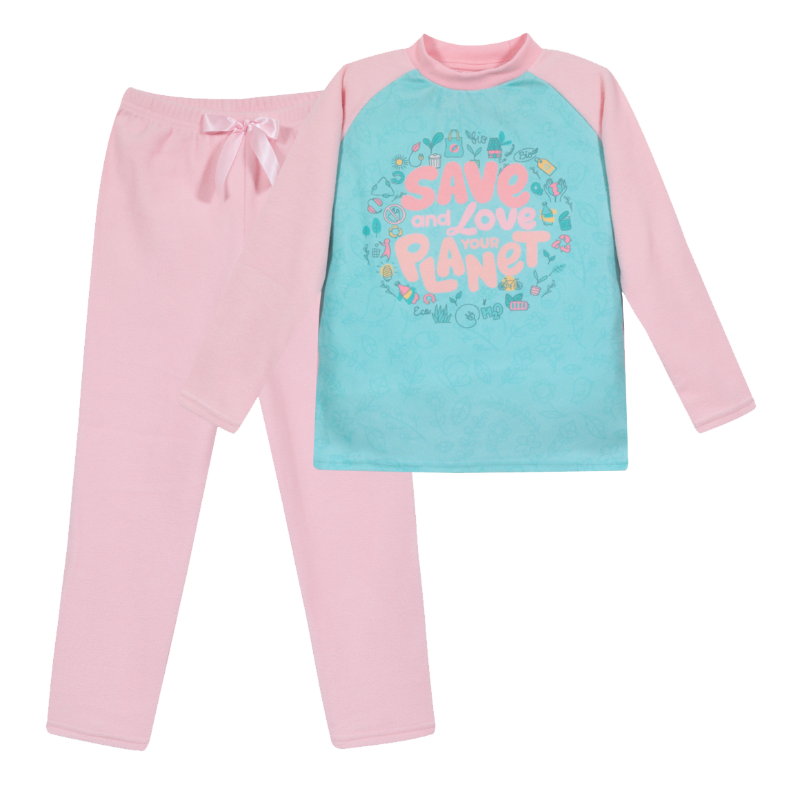 Pijama de 2 piezas para niñas en tela 100 % Poliéster reciclado,delantero completamente sublimado con motivo H2O Wear Love your Planet ,manga larga, cuello de rib para mayor comodidad en el calce, pantalón de polar, tela 100% poliéster con suave elástico en la cintura y cinta decorativa. Disponible en tallas 4,6,8,y 10. Para prolongar su durabilidad lavar con agua tibia,detergente suave y no planchar.Nuestra marca H2O Wear esta permanentemente preocupada de desarrollar productos cómodos y de alta calidad. Todo el espíritu de nuestra marca lo da un innovador equipo de personas que en cada temporada está creando nuevos conceptos para sus prendas.
