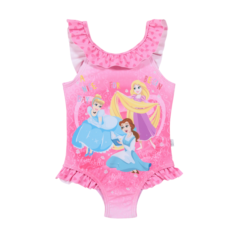 Traje de Baño Entero Princesas Cenicienta, Bella y Rapunzel Disney Sublimado con vuelos en tirantes y piernas. Efecto Glitter en letras. Tela Diseñada con fondo de corazones en vuelo. Composición de la tela: 85% Poliéster 15% Elastano 200 grs / 82% Poliamida 18% Elastano 200 grs. Forro 100% Poliéster.